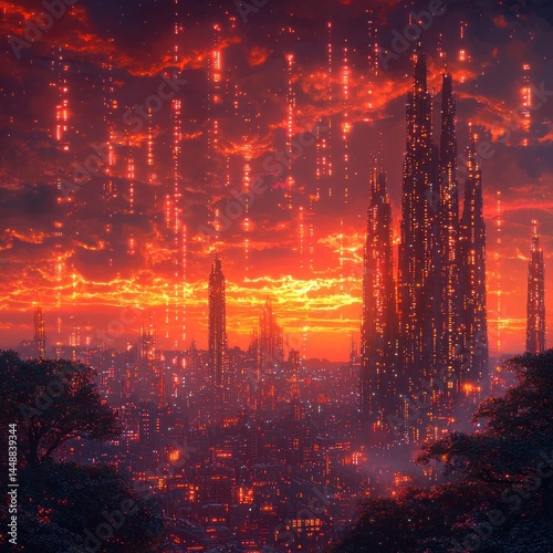 © Biancaart, Obraz premium Futuristic Cityscape with Tall Buildings and Glowing Skies at Sunset