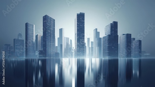 © PANINN 369, Fototapeta premium Futuristic Cityscape with Tall Skyscrapers and Reflective Water Surface at Dawn