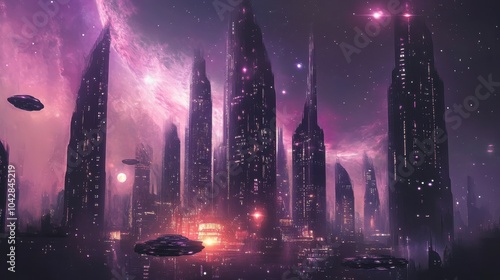 Obraz premium Futuristic cityscape with towering skyscrapers and spaceships in space