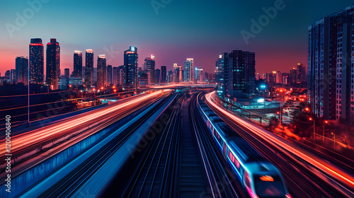© Thiago, Obraz premium Futuristic cityscape with train. Cyberpunk Cityscape Night. Illustration