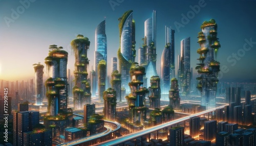 © Chayan, Fototapeta premium Futuristic Cityscape with Vertical Gardens at Dusk