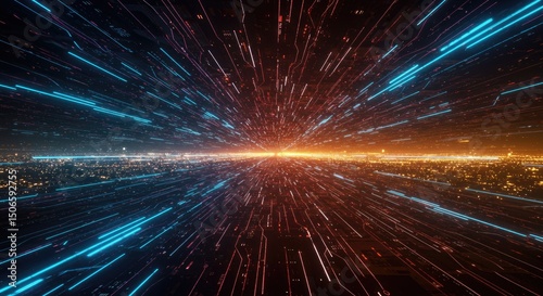 Naklejka premium Futuristic cityscape with vibrant, digital lines