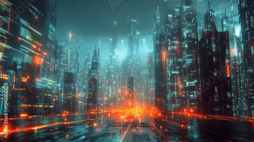 Fototapeta premium Futuristic cityscape with vibrant neon lights and a dynamic atmosphere.