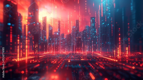 © Supatip, Naklejka premium futuristic cityscape with vibrant red and blue hues, depicting a digital world, digital city, cyberpunk