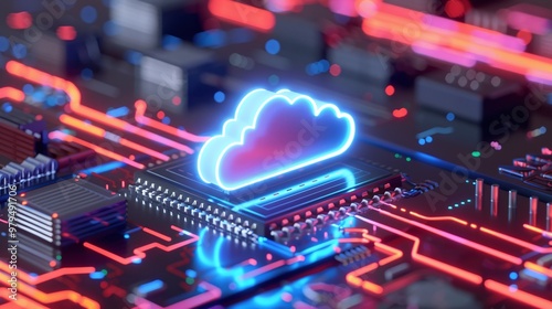 Fototapeta premium Futuristic cloud computing concept with glowing circuitry design, showcasing advanced technology and digital connectivity.