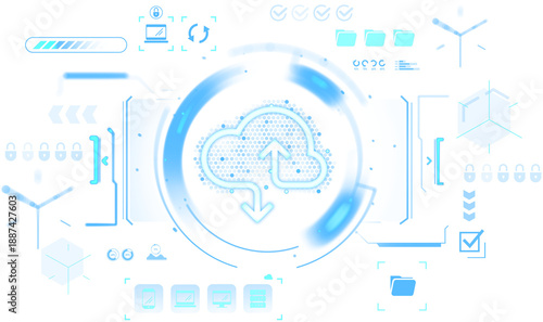 © ImageFlow, Naklejka premium Futuristic cloud upload and download icon in blue HUD interface graphics, isolated on white background, representing secure data transfer business concept