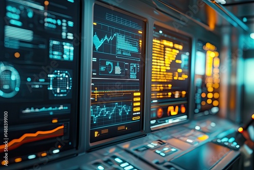 Fototapeta premium Futuristic cockpit displays with various data visualizations