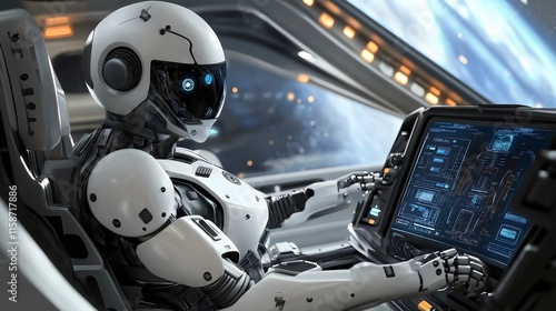 Fototapeta premium Futuristic cockpit, humanoid robot, space travel, sleek design, sci-fi...