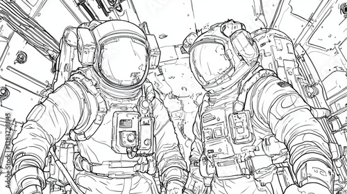 Obraz premium Futuristic Coloring Book Page Featuring Two Astronauts in a Spacecraft with Intricate Details