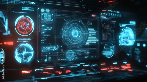 Fototapeta premium Futuristic Command Center Interface Displaying Complex Data Visualizations and System Diagnostics