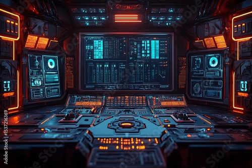 Obraz premium Futuristic command center interior featuring advanced technology and digital...