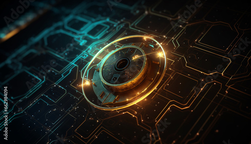 © Stockgiu, Obraz premium Futuristic computer chip pattern glows with blue semiconductor electricity generated by AI