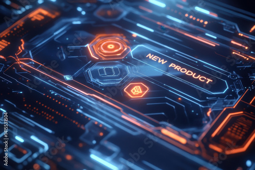 Fototapeta premium Futuristic computer displaying 'New Product' text prominently.