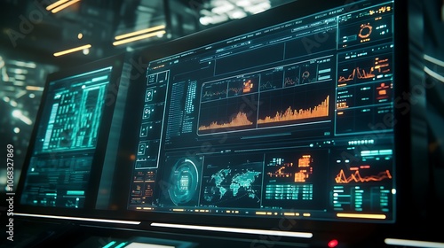 Obraz premium Futuristic Computer Monitors Displaying Data and Graphs