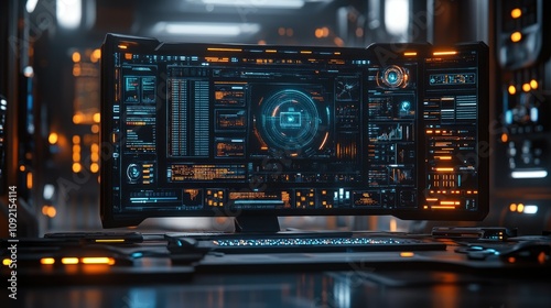 Obraz premium Futuristic computer setup displaying a high-tech interface in a dimly lit...