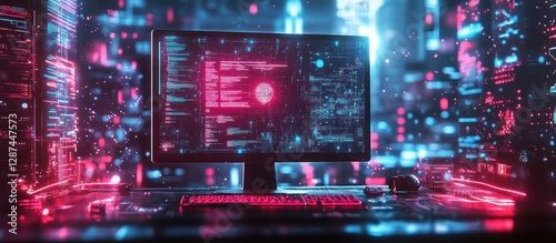 © Bagus, Obraz premium Futuristic computer setup with glowing data visuals.