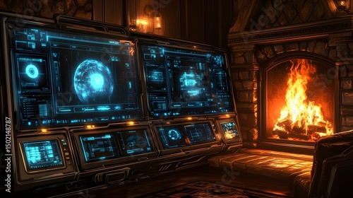 © suprato, Obraz premium Futuristic console by a cozy fireplace.