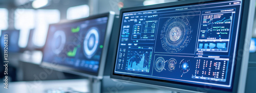Obraz premium Futuristic control center with data analysis screens displaying information