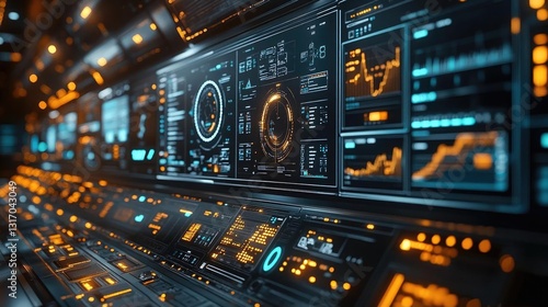 © munawaroh, Obraz premium Futuristic control panel displaying data analytics and graphs in a high-tech environment