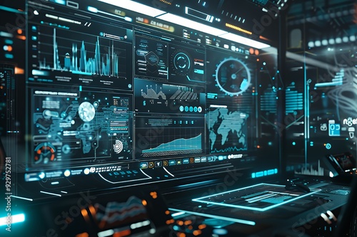 Fototapeta premium Futuristic control panel displaying data analytics and visualizations.
