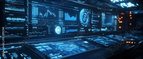 Obraz premium Futuristic control panel displaying data and analytics in a tech environment.