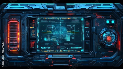 Obraz premium Futuristic control panel interface displaying data analysis in a high-tech environment