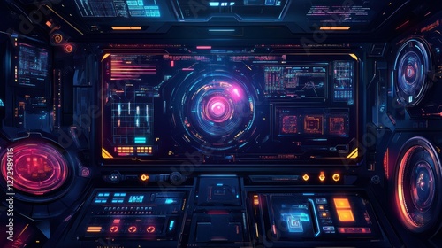 Fototapeta premium Futuristic control panel interface with vibrant neon lights and intricate data displays