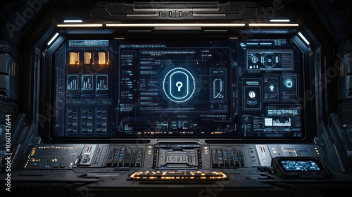 Obraz premium Futuristic control panel with a glowing blue key icon on a large screen.