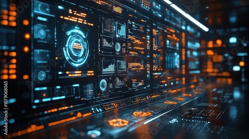 Fototapeta premium Futuristic control panel with data displays and glowing interfaces.