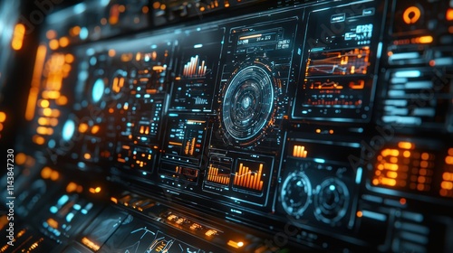 © novitasary, Obraz premium Futuristic control panel with data visualizations.