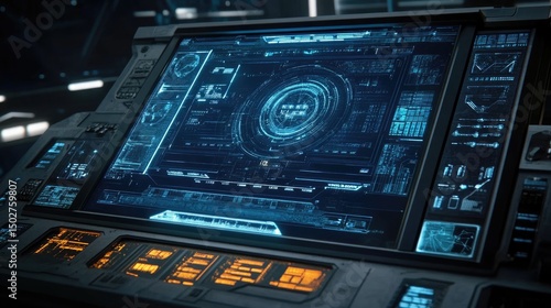 © Hasriana, Fototapeta premium Futuristic control panel with glowing blue interface displays data and controls