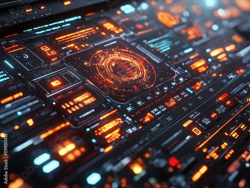 Obraz premium Futuristic control panel with glowing data interface in spaceship cockpit