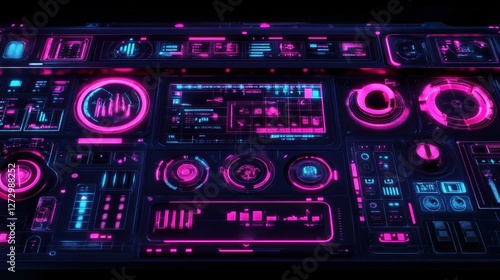 Obraz premium Futuristic control panel with glowing interface elements, displaying data analytics and graphs