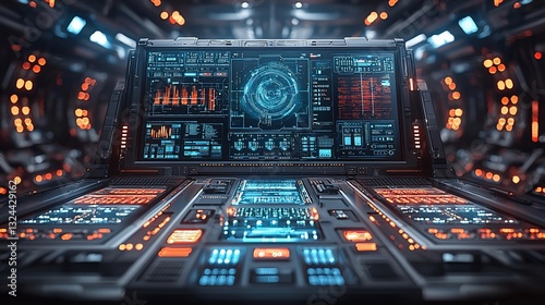 Fototapeta premium Futuristic control panel with glowing interface in a high-tech spaceship interior