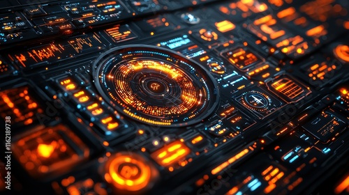 © novitasary, Obraz premium Futuristic control panel with glowing interfaces.