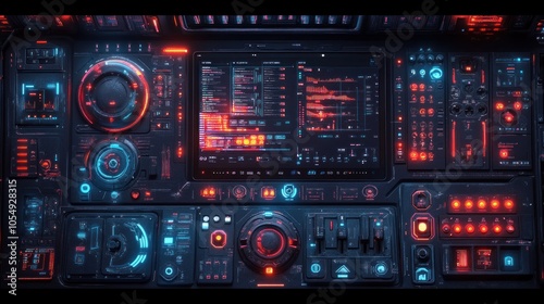 Obraz premium Futuristic control panel with glowing interfaces and buttons.