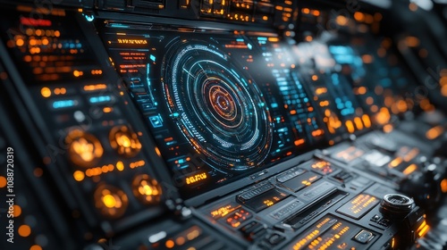 Obraz premium Futuristic control panel with glowing interfaces and buttons.