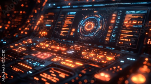 Obraz premium Futuristic control panel with glowing interfaces and data displays.
