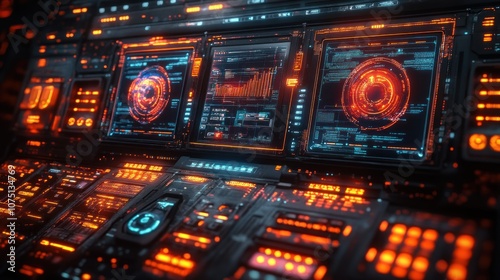 Obraz premium Futuristic control panel with glowing interfaces and data displays.