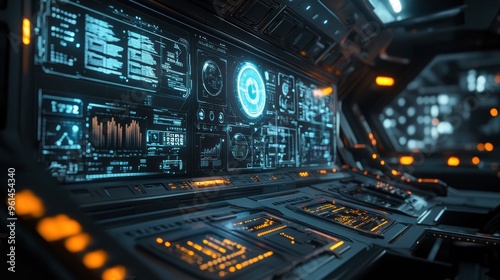 Fototapeta premium Futuristic control panel with glowing interfaces and data displays.