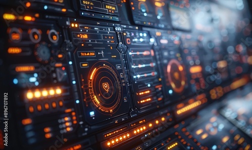 Obraz premium Futuristic control panel with glowing lights and digital interface, depicting...