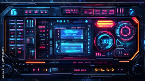 Obraz premium Futuristic control panel with glowing neon elements, displaying data in a...