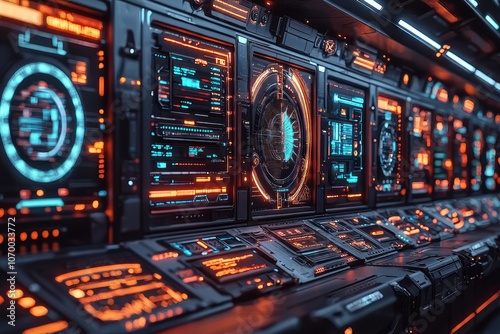 Obraz premium Futuristic Control Panel with Glowing Orange and Blue Interfaces