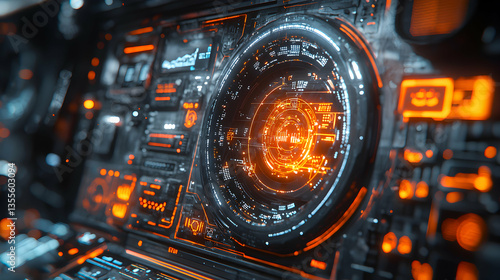 Fototapeta premium Futuristic control panel with glowing orange details. Use for sci-fi game UI or futuristic tech visualization to create immersive user experiences.