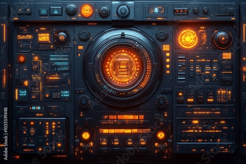 Obraz premium Futuristic control panel with glowing orange elements against a dark background.