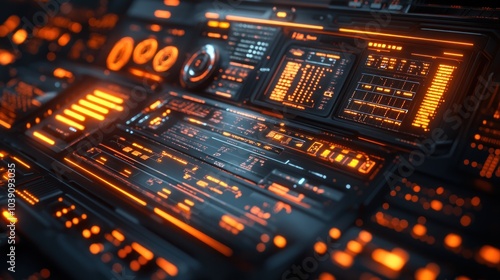 Obraz premium Futuristic control panel with glowing orange elements and displays.