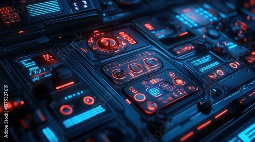 Fototapeta premium Futuristic control panel with glowing red and blue digital interfaces, buttons, and switches.