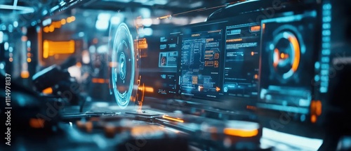 © wikkie, Obraz premium Futuristic control panel with glowing screens and data displays.