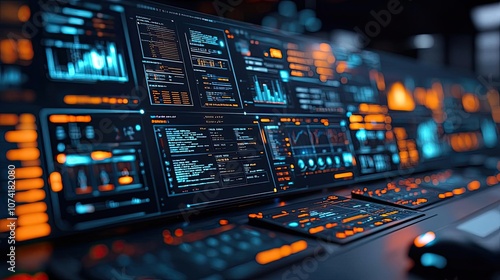 © Thamonchanok, Obraz premium Futuristic control panel with glowing screens and data visualizations.