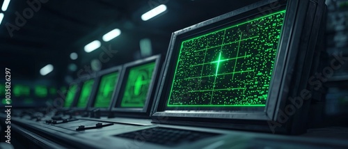 Obraz premium Futuristic control panel with green data screens in a technology setting.